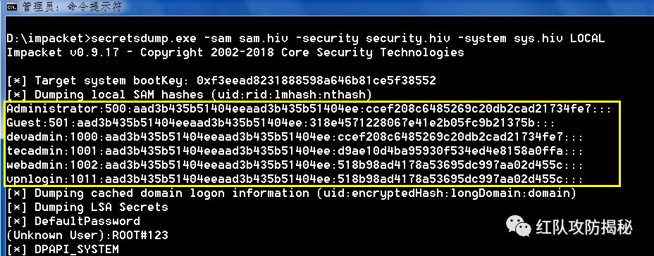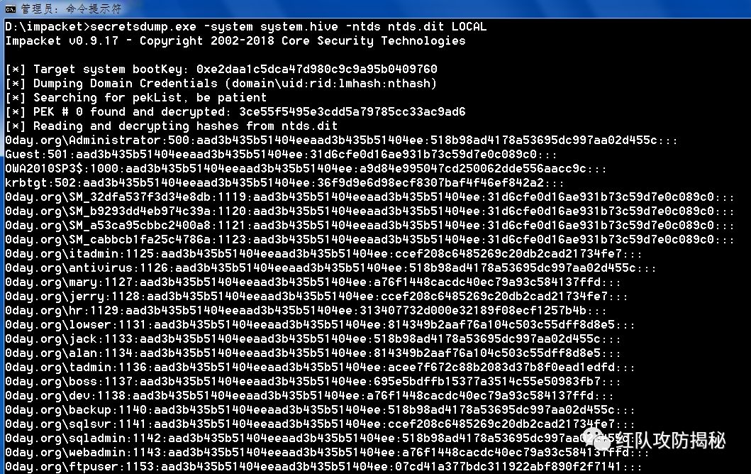 然后将上述导出的ntds.dit和system.hive再想办法拖回本地继续用secretsdump.exe进行解析即可,同样,你也可以把secretsdump.exe直接丢到目标系统里去解