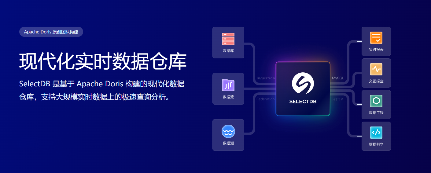 SelectDB 是一个基于 Apache Doris 构建的现代化数据仓库,它主要用于支持大规模数据的实时分析和查询。SelectDB 采用了分布式架构,能够跨多个节点存储和查询数据,从而提高了系统的可扩展性和性能;SelectDB 在数据写入方面能够达到秒级的实时数据写入,以及从数据库和数据流中流式数据同步,配置了实时更新、实时追加和实时预聚合的数据存储引擎。在实时数据服务和交互式即席查询上都拥有极速响应。