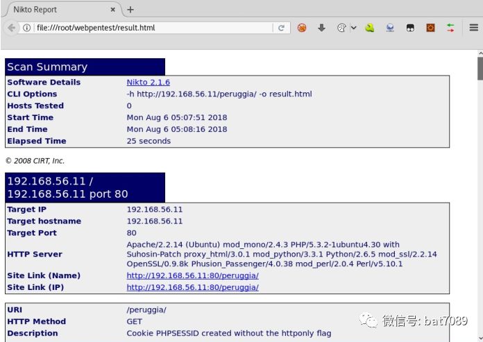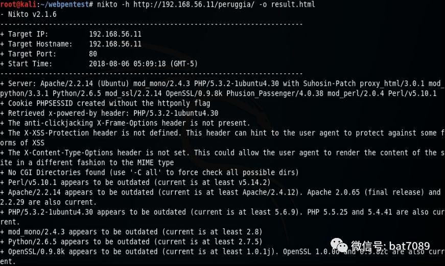 1. 我们将扫描Peruggia漏洞应用程序,并将结果导出到一个HTML报告文件,该命令为:nikto -hhttp://192.168.56.11/peruggia/ -o result.html。输出是这样的: