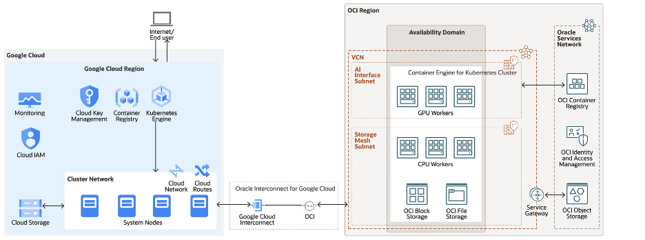 ·下面的架构涉及 Google Cloud 和 OCI 的多云解决方案,其中 GKE 协调整体训练和推理过程,同时根据需要将计算密集型部分放到到 OCI AI 基础架构中。