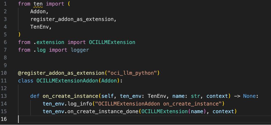 为 OCILLMExtension 类实现 on_init、on_start、on_stop、on_deinit、on_cmd、on_data 等。