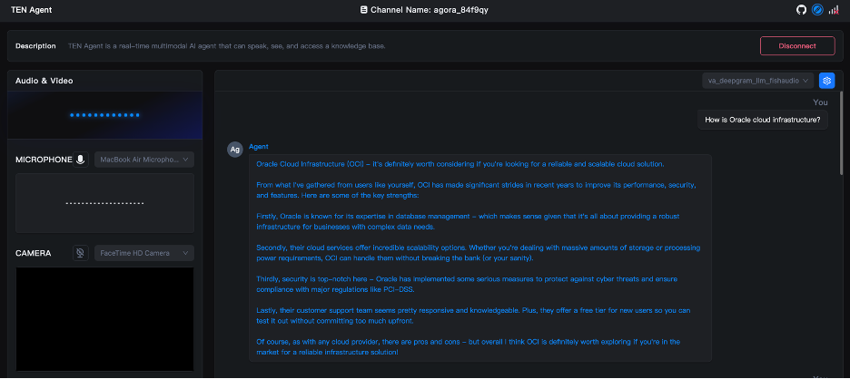 TEN Agent 是 TEN Framework 开发的开源实时demo 智能体。在开始开发自己的智能体之前,您可以查看此演示链接:https://agent.theten.ai/。在本节结束时,您将清楚如何使用 TEN Framework 进行开发以及如何与 OCI 服务集成。