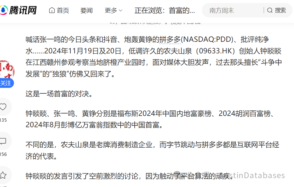 无独有偶,知名的中国首富,钟睒睒也在最近评论了中国的平台体系,是中国的经济内卷的罪魁祸首。
