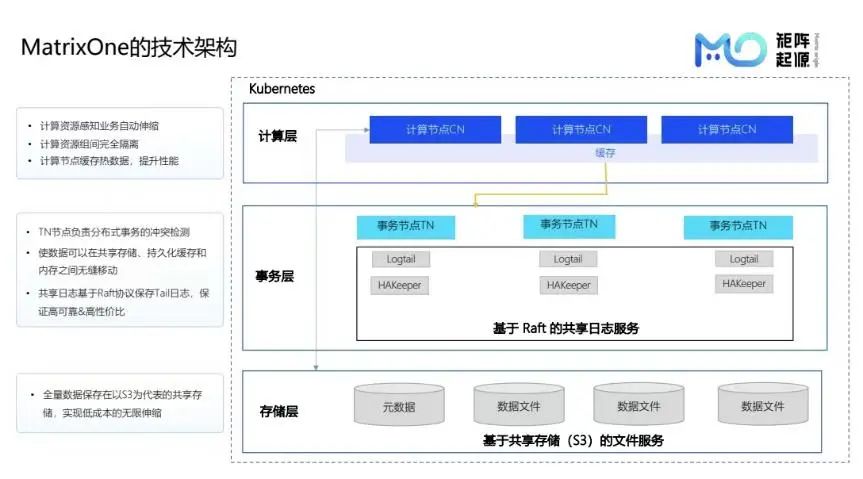 MatrixOne云原生数据库,完全基于Kubernetes容器化架构,由下而上三层次设计。