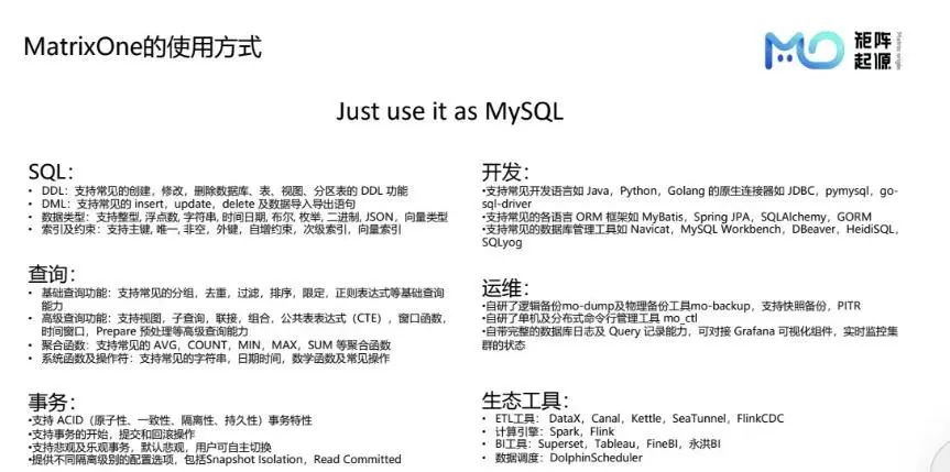 MatrixOne的设计理念之一即为高度兼容MySQL,致力于简化应用开发与日常运维流程。以下概述其关键特性与优势: