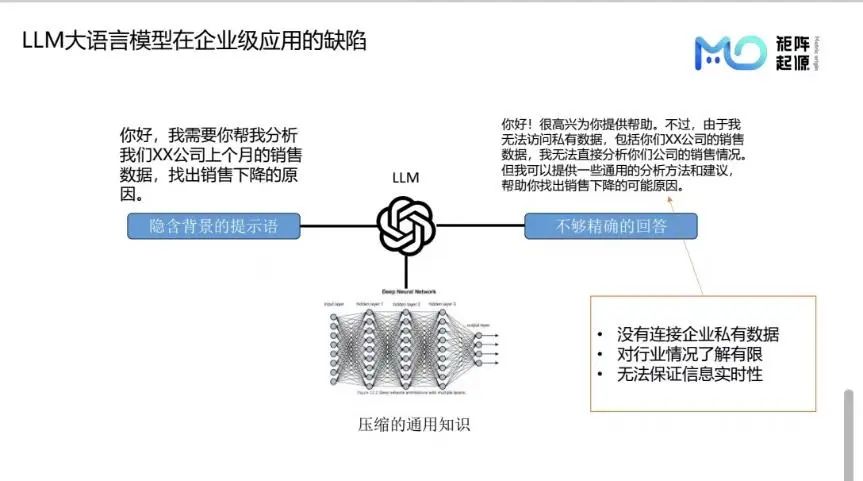 近年来,大语言模型(LLM)引发行业热潮,因其强大的通用知识整合能力而广受欢迎。然而,企业在尝试将其落地时常遭遇瓶颈——LLM缺乏行业特异性知识,难以捕捉专业领域细微之处,从而导致信息不准确或“幻觉”问题频发。根源在于模型仅浓缩公共知识,未能涵盖企业专有数据的独特性。