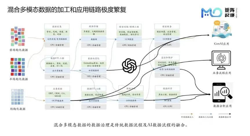 这种现象非常普遍,以往企业面对的多为结构化数据,使用流程相对成熟。而大模型场景下,转向非结构化数据处理,传统ETL pipeline不再适用。非结构化数据的多样性和复杂性要求超越单一向量数据库解决方案,即便是一份文档,也可能含图、表、文本混排,需多轮AI算法处理方可提取有效信息。另外,结构化数据承载高价值与现实联系,须与非结构化数据协同,构建综合性数据管理方案。因此整个过程纷繁复杂,涉及多元数据类型的处理与大模型交互,形成了“麻花式”数据链路。