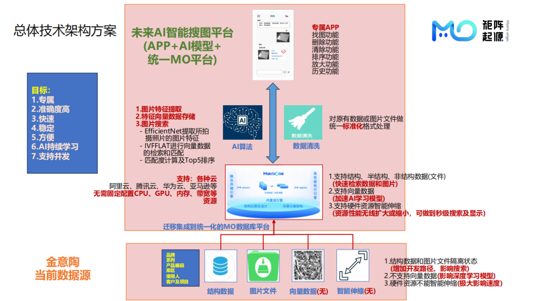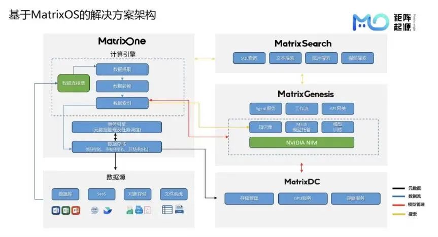 MatrixDC平台负责GPU管理与资源分配,提供接口屏蔽GPU配置复杂性;同时,MatrixDC支撑MatrixOne和MatrixGenesis的容器服务管理,确保基于Kubernetes(K8s)和容器化服务稳定运行。MatrixGenesis和MatrixSearch引擎专注多模态数据搜索,整合已加工信息,执行向量、关键字与SQL结构化搜索,经大模型重排序后,提供最相关数据结果,构建多模态搜索架构。
