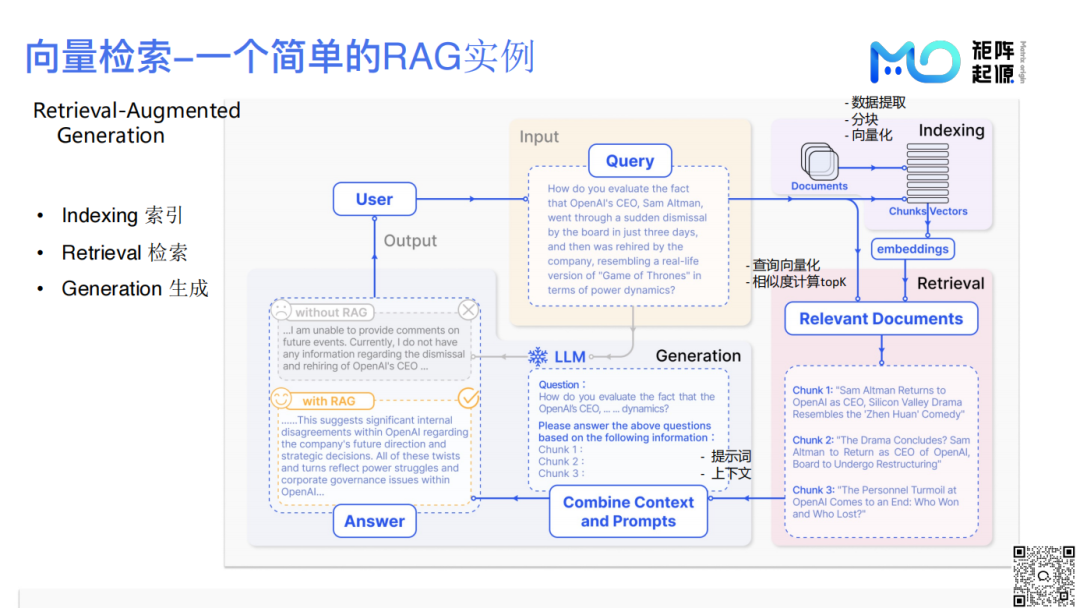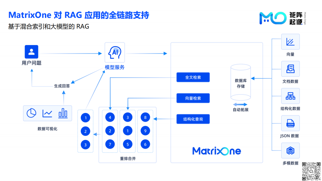 MatrixOne打通了从数据源到检索,到重排合并,再到生成回答的整个过程,实现了在一个平台中对RAG应用提供全链路支持。
