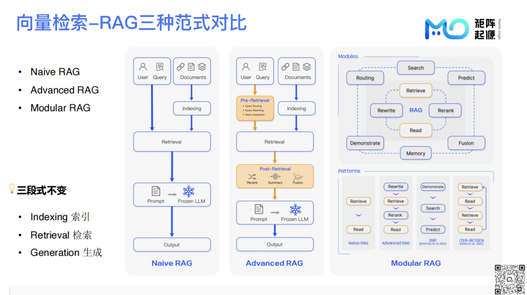 当前,RAG有三种范式。前面介绍的是最朴素的形式(Naïve RAG)。为了进一步提高准确性,针对检索模块增加了前处理和后处理,如查询改写和结果重排等,这就是进阶模式(Advanced RAG)。现今趋势转向模块化设计,可以灵活组合各个组件,也就是Modular RAG的模式,但仍坚守三段式核心。
