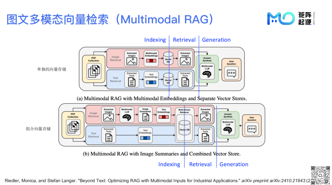 跨模态检索,涉及模型预处理,使异构数据在同一向量库中实现互联。本次分享聚焦于图文多模态检索。具体而言,图片转文本描述,注入文本向量库,便于与文本询问时共索,无论纯文本或图文结合提问,均能在同一向量库检索,扩展查询范围与应答能力。