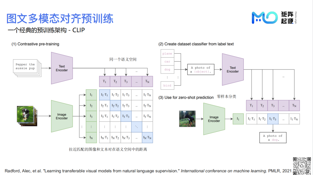 实现跨模态检索的核心在于将文本和图像的向量表示对齐到同一个语义空间,确保它们能够实现语义融合。CLIP(Contrastive Language-Image Pre-training)架构通过对比学习损失函数,有效缩小匹配文本和图像在语义空间中的距离,建立两者之间的紧密关联。例如,当用户输入“狗的图片”作为查询,CLIP可以将文本转化为向量,与候选图像的向量进行相似性比较,从而完成检索任务。CLIP这一架构提供了强大的跨模态表示能力,已成为跨模态预训练的经典范式。