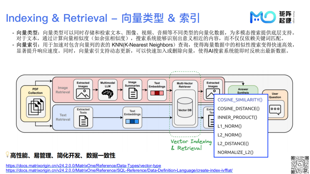 为了提升检索性能,MatrixOne提供了向量索引的能力,可以显著提高相似性搜索的速度。同时,支持动态索引更新,新文件上传后,如PDF文档,无需等待全局更新,即可快速完成索引,保证数据时效性。