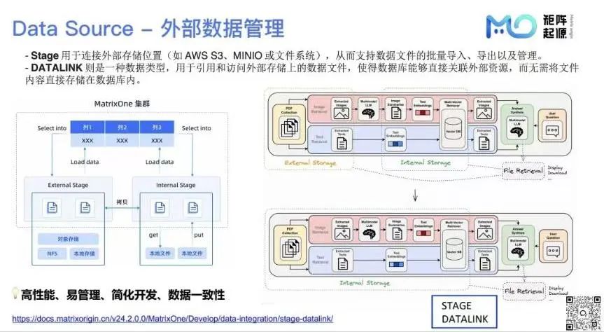 针对外部数据管理,MatrixOne提供了Stage功能,用于连接外部存储位置,从而支持数据文件的批量导入、导出以及管理。