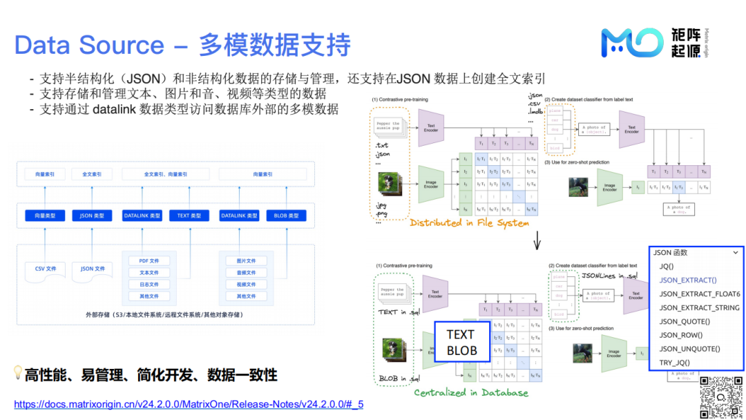 MatrixOne支持半结构化和非结构化数据的存储与管理,还支持在JSON上创建全文索引。MatrixOne提供了一体化服务,将元数据集中于数据库中,避免分散存放,更易于管理和访问,同时可以保证数据一致性。