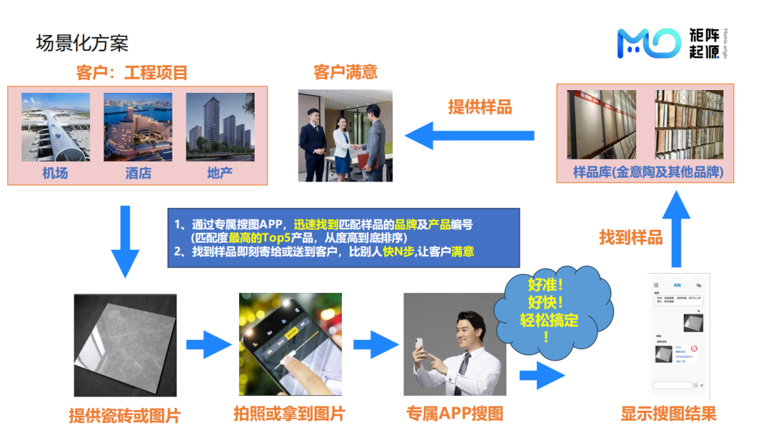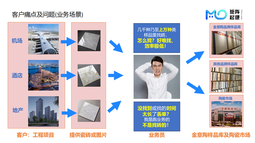 该案例是一个瓷砖样本检索的场景。瓷砖外观相近,业务员要人工在成千上万种瓷砖中查找,效率非常低下,影响订单成交率。