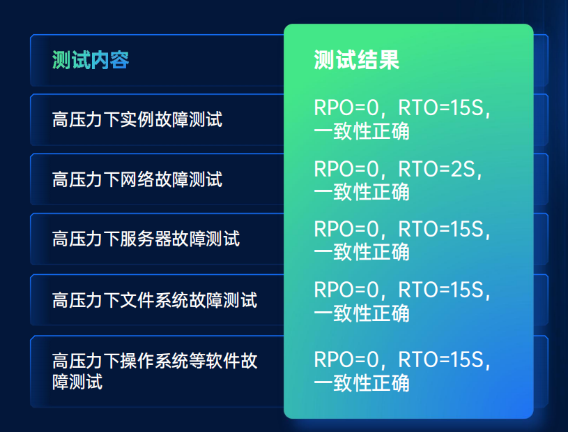 YAC产品在性能极限的负载下做高可用测试,所测故障场景均可做到正确的识别切换,RPO=0,RTO<15S,一致性正确。