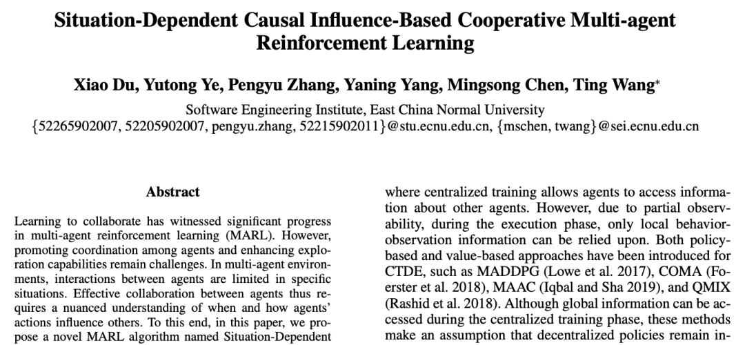 加强智能体之间的协同作用和提升其在复杂环境中的适应能力是一个相对困难的问题。在多智能体系统中,智能体之间的互动在某些情境下是受限的。因此,要实现智能体之间的高效合作,就必须深入理解智能体的行为在何时以及如何对其他智能体产生影响。为此,作者提出了一种创新的多智能体强化学习(MARL)策略,即情境依赖因果影响多智能体协作强化学习(SCIC),旨在增强智能体的协同和探索效率。SCIC算法通过深入分析智能体在多智能体环境中的因果关系,运用因果干预和条件互信息技术,在特定情境中识别一个智能体的行为如何影响其他智能体。这一方法使智能体可以识别出能够对其他智能体产生积极影响的状态,从而推动智能体之间的协作。