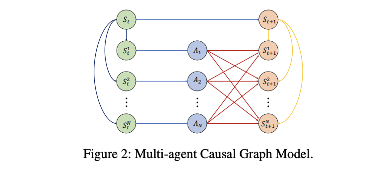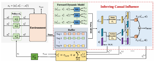 该算法利用因果干预和条件互信息这两个强大的工具来检测智能体间在特定情境下的因果影响。因果干预允许我们模拟改变一个智能体的行为或状态,以观察对其他智能体的影响,而条件互信息则帮助我们量化不同智能体状态之间的相互依赖性。通过这种方法,我们能够揭示智能体间潜在的因果链,从而为智能体提供指导,探索那些可能对其他智能体产生积极影响的状态。这种检测机制不仅增强了智能体对环境的理解,还为智能体提供了优化其行为的依据,以实现更高效的协作和目标达成。2. 内在奖励分配: