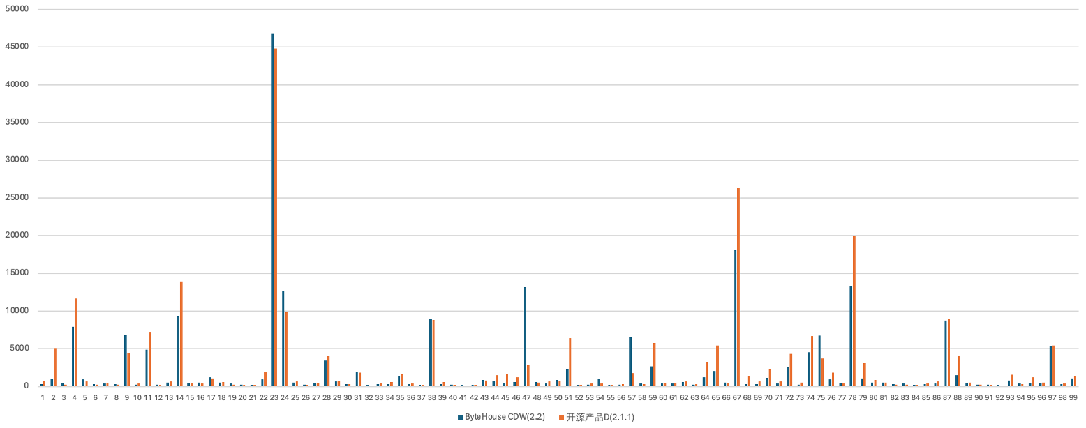 TPC-DS 1TiB: ByteHouse 云数仓(2.2) 228s, 开源产品 D(2.1.1) 264s,超越 16%