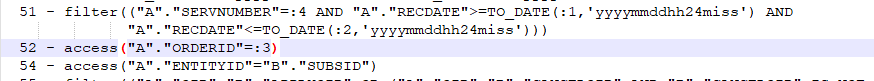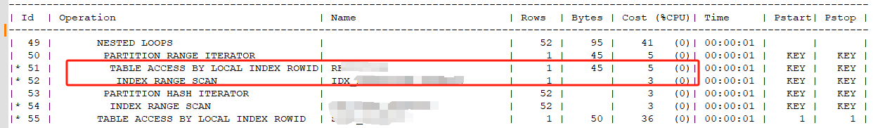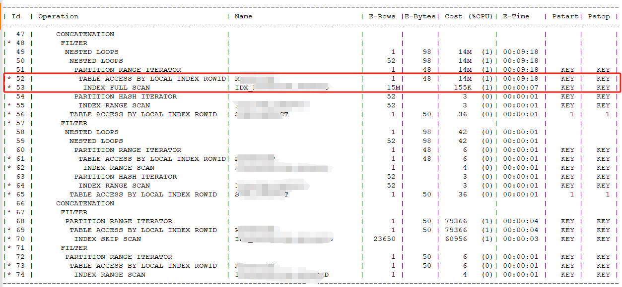 查看执行计划,因执行计划太长,截取关键部分。53步-索引全扫描(INDEX FULL SCAN)E-ROWS 15M行数据,在52步回表的时候耗费巨大时间(该表行5亿+、占用200G+)。