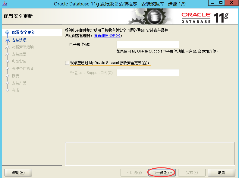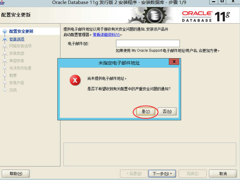 4、配置安全更新,如图所示,点“下一步”,提示未提供邮件地址,点“是”跳过。
