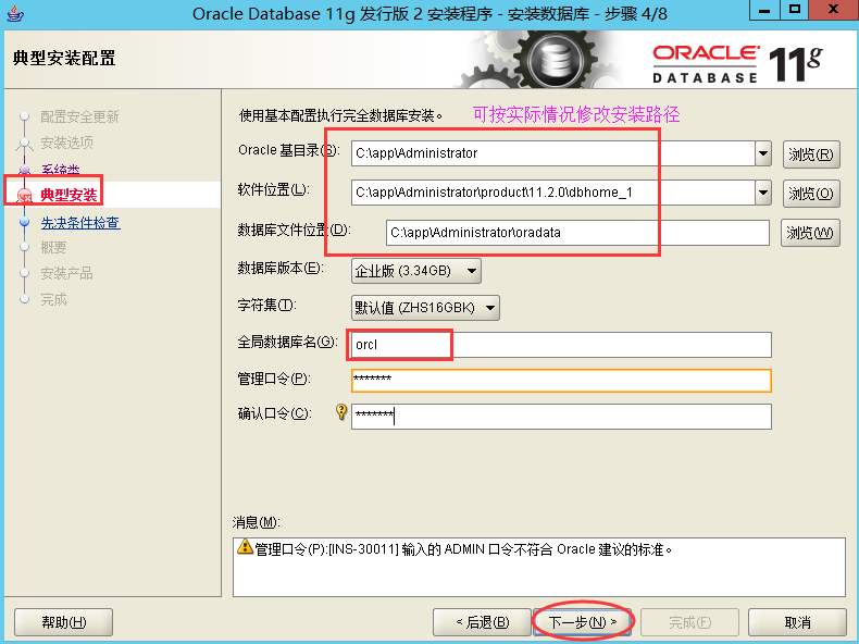 7、典型安装配置,可按实际情况修改安装路径,输入管理口令后点“下一点”。