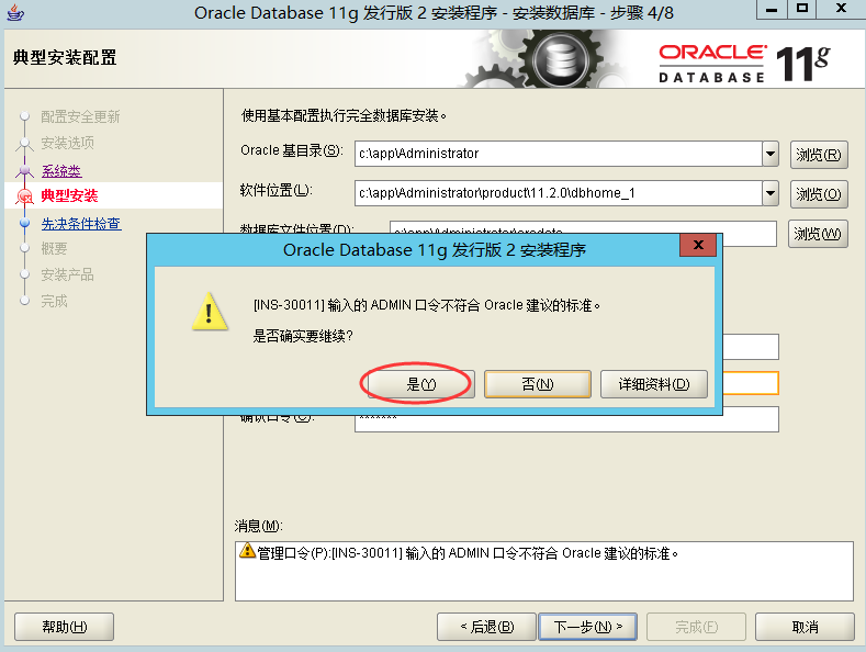 因为是学习环境,所以口令输入比较简单,安装会如下提示,点“是”跳过。
