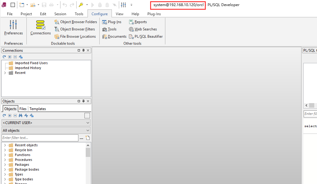 2、用户system,密码是安装时输入的口令,因为我是虚拟机服务器安装Oracle服务,现在自己电脑通过远程访问192.168.10.120/orcl