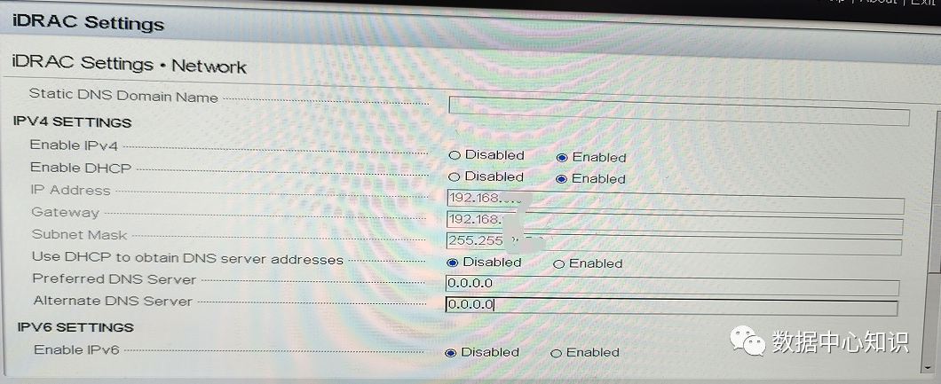 5.下拉右侧的滚动条至 IPV4 SETTINGS。IDRAC9 默认 IP 地址为DHCP 分配,