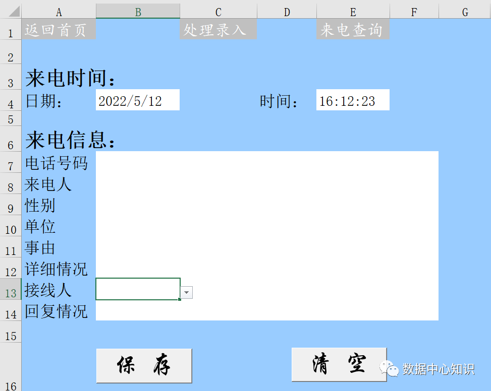 来电录入工作表中,上面是三个超链接,下面是两个按钮,中间的部分是录入内容。时间这块是自动取当时的时间,这个用个公式就可以了。通过下拉菜单将部分快捷输入部分内容,关键在于两个按钮,下面就将两个按钮对应的vba内容粘贴如下: