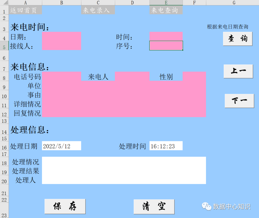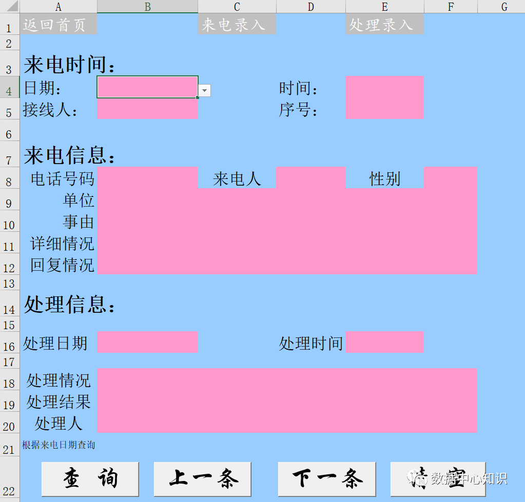 来电查询工作表,上面三个超链接,中间一些内容单元格,下面四个按钮,按钮对应的代码相信不用再过多介绍了,程序员被称为码农,因为一直做着重复的事情。