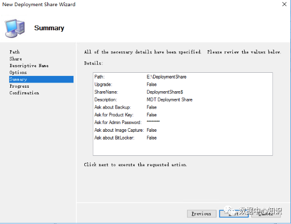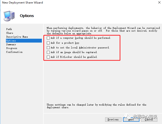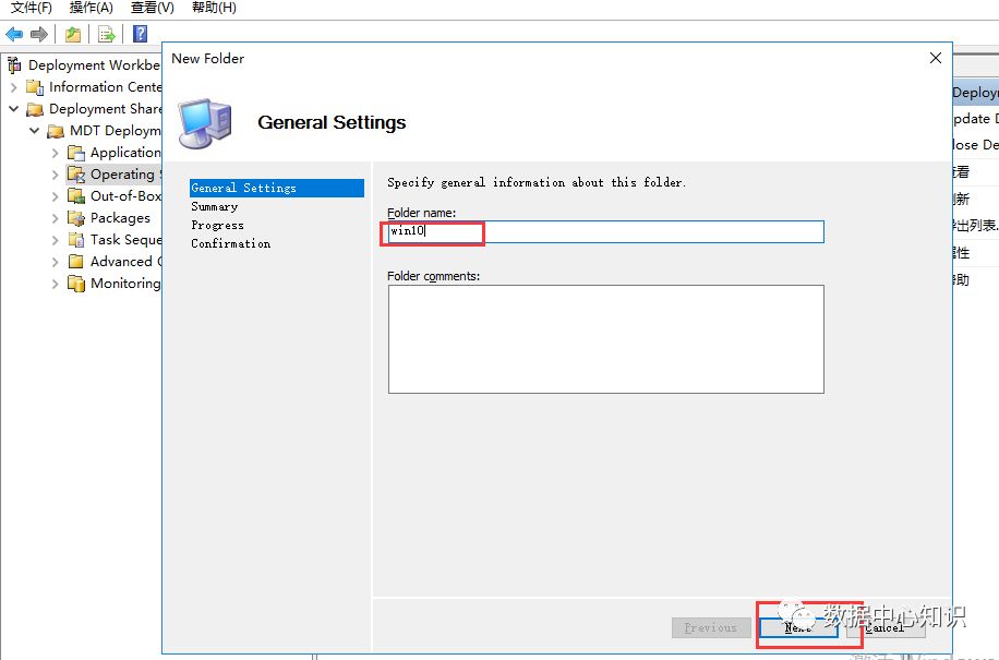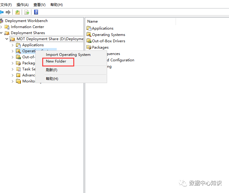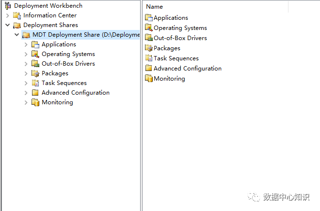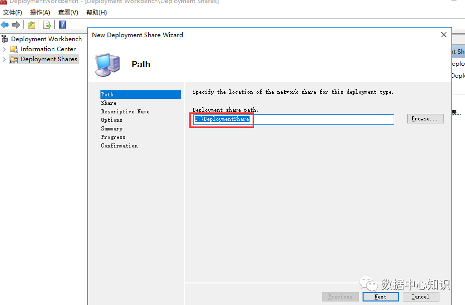 打开 MDT 控制台“Deployment Workbench”,选中“Deployment Share”右键“New Deployment Share”指定网络共享路径“C:\DeploymentShare”,可以自定义设置,Next: