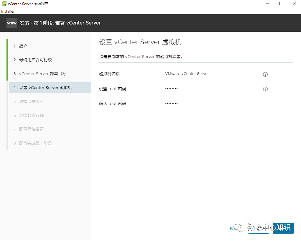 再接下来就要写新建服务的密码,这个就安装的时候会自动新建一台服务器,这台服务器用来运行vcenter server7.0设置好就点击下一步,开始设置vcenter server服务登录密码