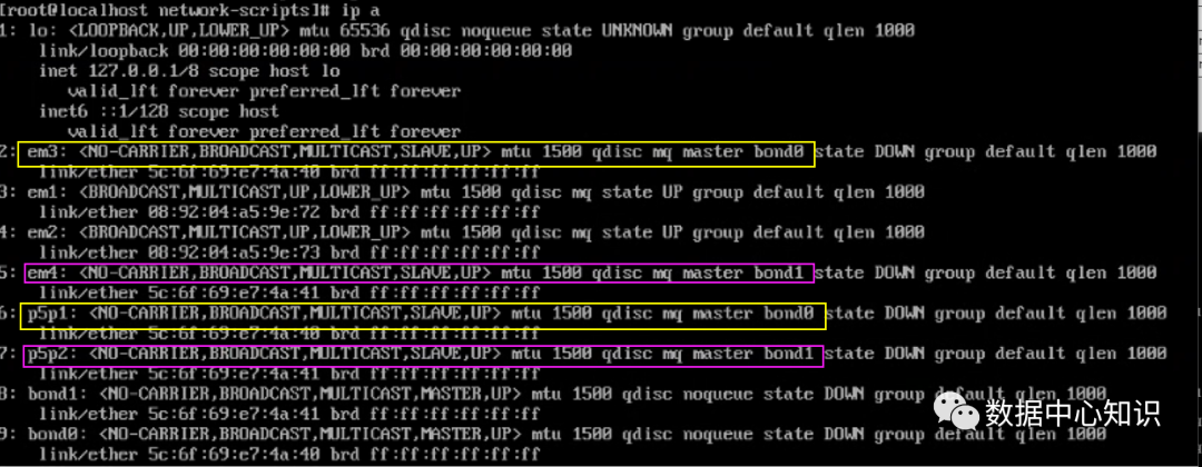 然后将四个万兆口两两绑定,具体的绑定方法,公众号前面有篇文章详细介绍,文章名《如何在一个小时内完成30台服务器本地yum源配置和25Gb网卡绑定》。唯一的区别就是绑定模式改为mode=6,或者改为mode=balance-alb,绑定后的结果如下: