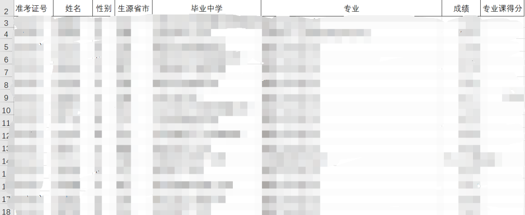 假设我们在网站上找到了一个表格,是《中国传媒大学2022年艺术类本科招生校考合格名单》,表格有准考证号、姓名、性别、生源省市、毕业中学、专业、成绩、专业课得分等几列。表格内容如下图所列。