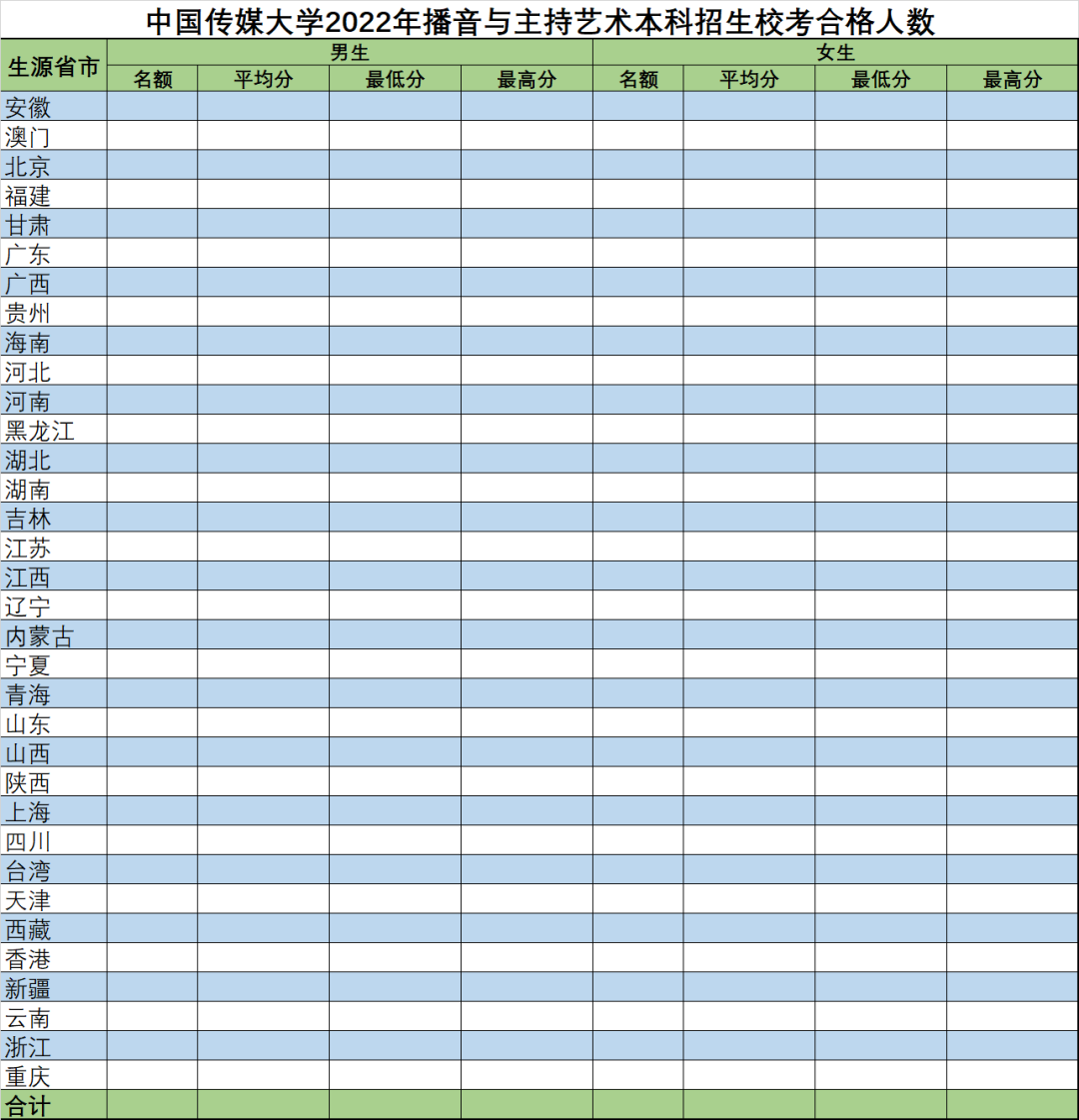 标题、字体、列名就不多介绍了,通过这样的表格,内容填充后,我就可以知晓各省男生和女生拿到合格证的人数多少,艺术得分情况了,得分这块我加了平均分、最低分和最高分三列。
