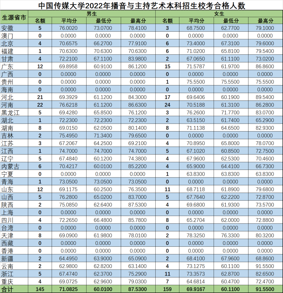 我关注的是播音与主持艺术专业的内容,这个专业招生人数只有男生50人,女生50人,艺术专业的合格证很重要,不过中传的这个专业录取是综合评分,先要拿到校考合格证,然后再根据校考综合得分和文化课的高考得分等综合评定。我想了解今年校考合格的各省男女生人数以及得分情况。