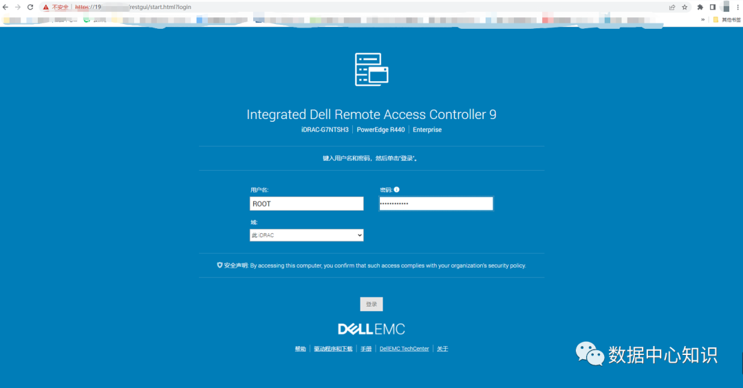 7、使用笔记本远程客户现场笔记本输入服务器IP地址进入网址,并输入服务器IDRAC 用户名和密码,点击登陆。